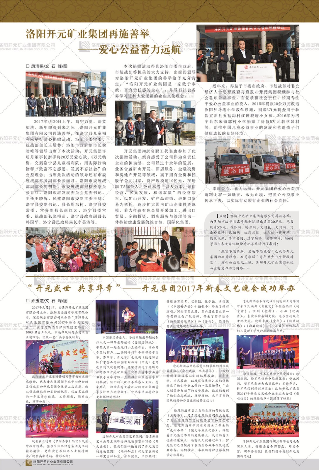 洛陽開元礦業(yè)集團有限公司簡介洛陽開元礦業(yè)集團有限公司,始成立于2006年,位于洛陽市開元大道269號。集團旗下共有五余家全資子公司,業(yè)務(wù)涉及有色金屬礦山開發(fā)、礦產(chǎn)品購銷與進出口貿(mào)易、房地產(chǎn)開發(fā)、文化藝術(shù)、企業(yè)管理與咨詢、資本投資等多個領(lǐng)域。民建河南省委委員、民建河南省委企業(yè)委副主任、民建洛陽市委委員、企業(yè)委主任、洛陽民建企業(yè)家協(xié)會會長許明月是公司創(chuàng)始人,現(xiàn)任洛陽開元礦業(yè)集團有限公司董事長。在礦業(yè)領(lǐng)域,洛陽開元礦業(yè)集團擁有多家實力雄厚的子公司:貴州開元礦業(yè)有限公司探、采礦權(quán)面積共11.33平方公里;興??h銅鑫礦業(yè)有限公司探礦權(quán)面積8.76平方公里,礦山資源潛力巨大;2021年,開元集團與盧氏中科礦業(yè)有限公司開展戰(zhàn)略合作。盧氏中科礦業(yè)有限公司專注于有色金屬的浮選、加工和銷售,擁有強大的技術(shù)支撐平臺,是集探、采、選、冶、研為一體的中大型綜合礦業(yè)企業(yè)。目前,盧氏中科王家河1000噸選礦廠已成功投產(chǎn),雙河金礦、柳關(guān)欒盧鉛鋅礦相繼順利開工,樓房銀礦與圪老灣鉛鋅礦的深部探礦重大突破,標(biāo)志著礦山版圖取得重大進展,為開元集團后續(xù)發(fā)展奠定了堅實基礎(chǔ)。在文化傳媒領(lǐng)域,洛陽市明月美術(shù)館通過豐富多樣的藝術(shù)展覽、學(xué)術(shù)研討和公共教育活動,努力打造一個集展覽、交流、教育、研究為一體的綜合性藝術(shù)平臺。此外,在金融投資領(lǐng)域,開元集團旗下的北京明峰資本管理有限公司專注于投資具有高增長潛力的優(yōu)秀企業(yè),特別是高科技、新能源、環(huán)保等新興產(chǎn)業(yè),為客戶提供個性化的資產(chǎn)配置服務(wù)。在做好企業(yè)經(jīng)營的同時,開元集團始終不忘企業(yè)的社會責(zé)任和家國情懷,以突出的愛心公益事跡,開展了一系列公益慈善活動:“民建林”公益事業(yè)通過“思源基金”“幫幫公益”線上公益平臺,與眾多愛心人士籌措資金20余萬元;資助541名貧困大學(xué)生共計270余萬元,推進“數(shù)字助力——河南AI人才培養(yǎng)”;捐款10萬元,馳援京津冀、黑龍江洪水地質(zhì)災(zāi)害……公司于2017年底被洛陽市慈善總會評為“洛陽慈善風(fēng)云榜——十大愛心集體”。洛陽開元礦業(yè)集團有限公司秉承持續(xù)發(fā)展理念,憑借多年來良好的企業(yè)信譽與經(jīng)營業(yè)績,與全國多家企業(yè)建立了良好合作關(guān)系,受到社會各界的一致好評,多次榮獲“納稅標(biāo)兵”“先進企業(yè)”“招商引資模范企業(yè)”等榮譽稱號?;赝麃頃r路,開元人勠力同心,以“闖”的精神和“創(chuàng)”的勁頭,一路披荊斬棘,踏過千山萬水;展望新未來,開元人凝心聚力,不執(zhí)于“舊”,無畏于“新”,秉承“勇于跨越,追求卓越”的企業(yè)精神,乘著國家高質(zhì)量發(fā)展新征程的東風(fēng),跨過高山,越過大海,向著集團多元化、國際化的目標(biāo),逐夢遠航,跨越前行!
