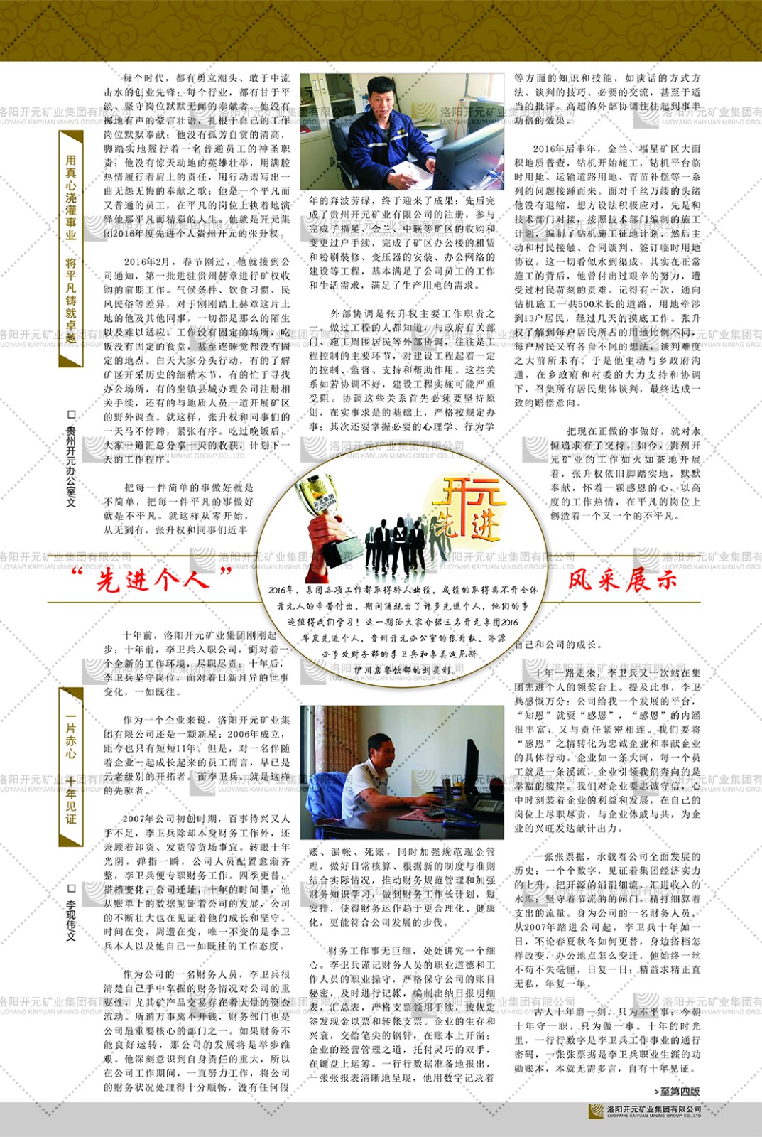 洛陽開元礦業(yè)集團(tuán)有限公司簡介洛陽開元礦業(yè)集團(tuán)有限公司,始成立于2006年,位于洛陽市開元大道269號(hào)。集團(tuán)旗下共有五余家全資子公司,業(yè)務(wù)涉及有色金屬礦山開發(fā)、礦產(chǎn)品購銷與進(jìn)出口貿(mào)易、房地產(chǎn)開發(fā)、文化藝術(shù)、企業(yè)管理與咨詢、資本投資等多個(gè)領(lǐng)域。民建河南省委委員、民建河南省委企業(yè)委副主任、民建洛陽市委委員、企業(yè)委主任、洛陽民建企業(yè)家協(xié)會(huì)會(huì)長許明月是公司創(chuàng)始人,現(xiàn)任洛陽開元礦業(yè)集團(tuán)有限公司董事長。在礦業(yè)領(lǐng)域,洛陽開元礦業(yè)集團(tuán)擁有多家實(shí)力雄厚的子公司:貴州開元礦業(yè)有限公司探、采礦權(quán)面積共11.33平方公里;興??h銅鑫礦業(yè)有限公司探礦權(quán)面積8.76平方公里,礦山資源潛力巨大;2021年,開元集團(tuán)與盧氏中科礦業(yè)有限公司開展戰(zhàn)略合作。盧氏中科礦業(yè)有限公司專注于有色金屬的浮選、加工和銷售,擁有強(qiáng)大的技術(shù)支撐平臺(tái),是集探、采、選、冶、研為一體的中大型綜合礦業(yè)企業(yè)。目前,盧氏中科王家河1000噸選礦廠已成功投產(chǎn),雙河金礦、柳關(guān)欒盧鉛鋅礦相繼順利開工,樓房銀礦與圪老灣鉛鋅礦的深部探礦重大突破,標(biāo)志著礦山版圖取得重大進(jìn)展,為開元集團(tuán)后續(xù)發(fā)展奠定了堅(jiān)實(shí)基礎(chǔ)。在文化傳媒領(lǐng)域,洛陽市明月美術(shù)館通過豐富多樣的藝術(shù)展覽、學(xué)術(shù)研討和公共教育活動(dòng),努力打造一個(gè)集展覽、交流、教育、研究為一體的綜合性藝術(shù)平臺(tái)。此外,在金融投資領(lǐng)域,開元集團(tuán)旗下的北京明峰資本管理有限公司專注于投資具有高增長潛力的優(yōu)秀企業(yè),特別是高科技、新能源、環(huán)保等新興產(chǎn)業(yè),為客戶提供個(gè)性化的資產(chǎn)配置服務(wù)。在做好企業(yè)經(jīng)營的同時(shí),開元集團(tuán)始終不忘企業(yè)的社會(huì)責(zé)任和家國情懷,以突出的愛心公益事跡,開展了一系列公益慈善活動(dòng):“民建林”公益事業(yè)通過“思源基金”“幫幫公益”線上公益平臺(tái),與眾多愛心人士籌措資金20余萬元;資助541名貧困大學(xué)生共計(jì)270余萬元,推進(jìn)“數(shù)字助力——河南AI人才培養(yǎng)”;捐款10萬元,馳援京津冀、黑龍江洪水地質(zhì)災(zāi)害……公司于2017年底被洛陽市慈善總會(huì)評(píng)為“洛陽慈善風(fēng)云榜——十大愛心集體”。洛陽開元礦業(yè)集團(tuán)有限公司秉承持續(xù)發(fā)展理念,憑借多年來良好的企業(yè)信譽(yù)與經(jīng)營業(yè)績,與全國多家企業(yè)建立了良好合作關(guān)系,受到社會(huì)各界的一致好評(píng),多次榮獲“納稅標(biāo)兵”“先進(jìn)企業(yè)”“招商引資模范企業(yè)”等榮譽(yù)稱號(hào)?;赝麃頃r(shí)路,開元人勠力同心,以“闖”的精神和“創(chuàng)”的勁頭,一路披荊斬棘,踏過千山萬水;展望新未來,開元人凝心聚力,不執(zhí)于“舊”,無畏于“新”,秉承“勇于跨越,追求卓越”的企業(yè)精神,乘著國家高質(zhì)量發(fā)展新征程的東風(fēng),跨過高山,越過大海,向著集團(tuán)多元化、國際化的目標(biāo),逐夢(mèng)遠(yuǎn)航,跨越前行!